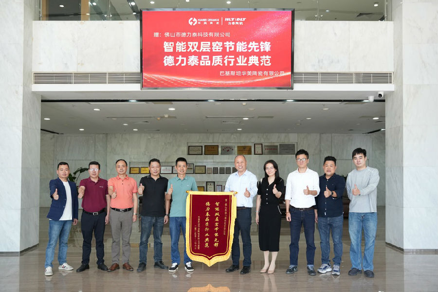 近日,巴基斯坦华美陶瓷有限公司(下称“华美陶瓷”)代表专访力泰陶机,将绣有“智能双层窑节能先锋,德力泰品质行业典范”的荣誉锦旗赠予德力泰科技总经理吴俊良,德力泰技术和服务团队及力泰陶机海外营销团队共同出席接旗仪式。这面锦旗不仅是对在 “华美陶瓷第二期智能化大板生产线” 项目中优秀表现的高度嘉奖,更是德力泰双层窑技术迭代升级的成功见证。
